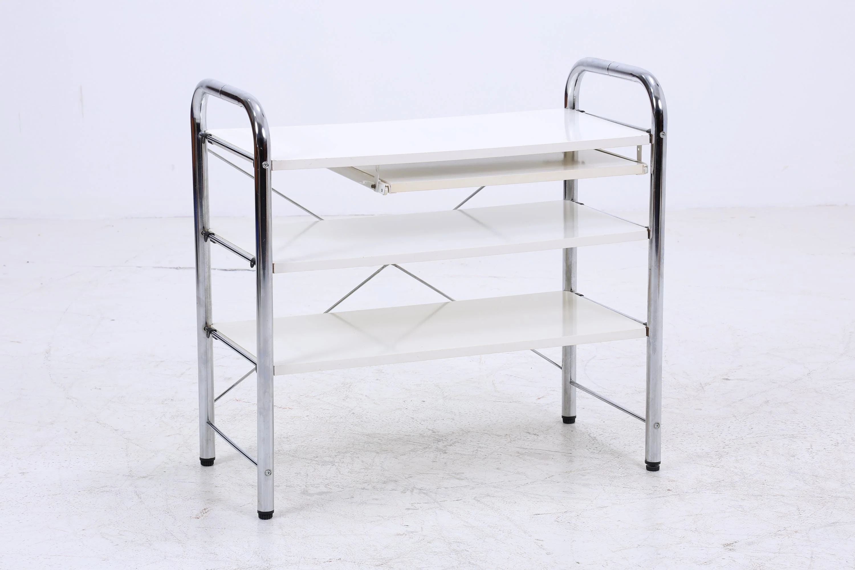 Vintage IKEA „Niklas“ Regal von Rutger Andersson aus den 80ern mit klarer, technischer Form und leichter Kombination aus Stahlrohr und Holz. Drei Böden und die ausziehbare Arbeitsfläche machen es flexibel – ein reduziertes Systemmöbel mit funktionalem Charakter.