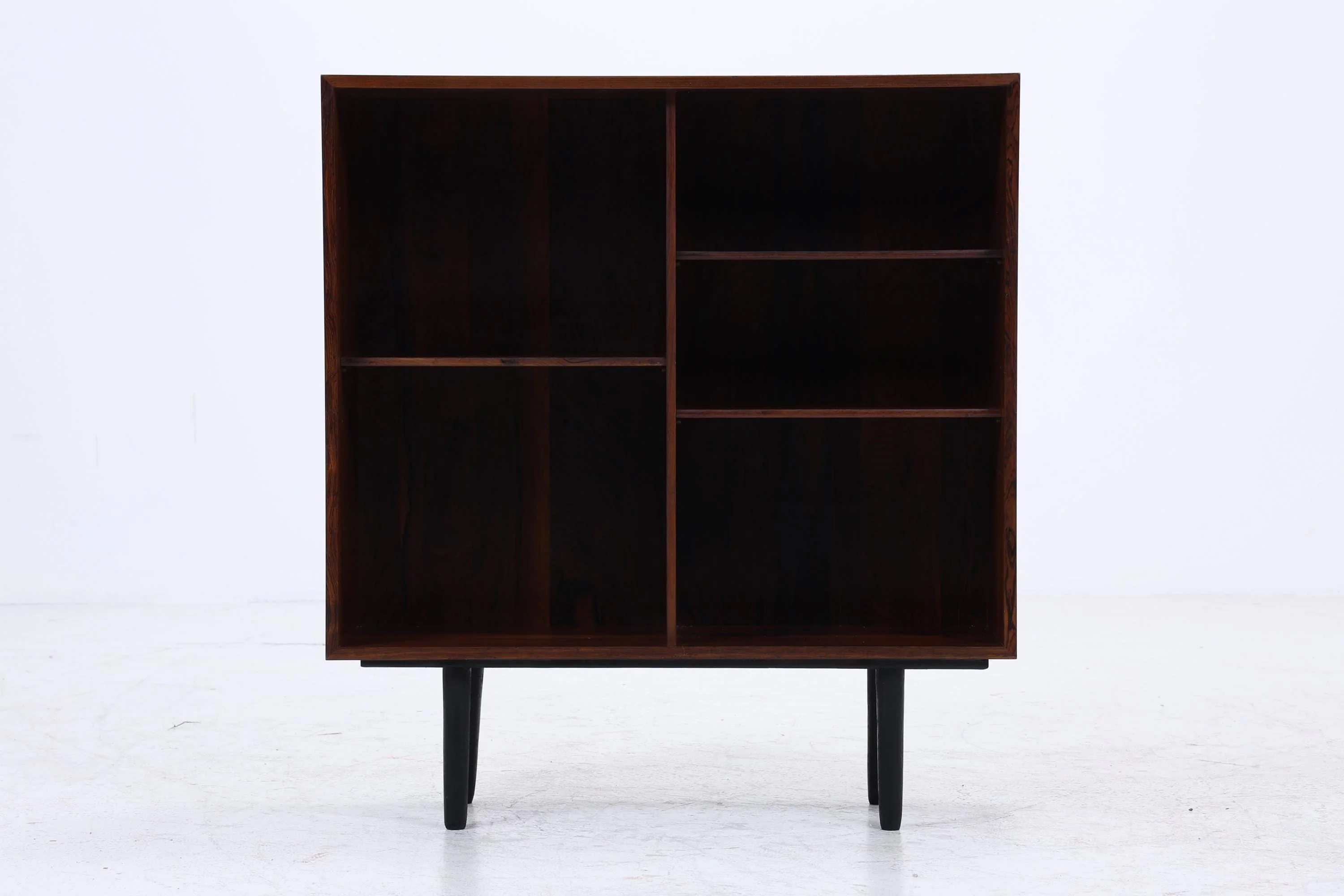 Vintage-Palisander-Regal aus den 60ern mit klarer, schlanker Form und markanter, dunkler Maserung. Die schwarzen, konischen Beine geben ihm Leichtigkeit – mehrere Böden sorgen für eine offene, saubere Struktur.