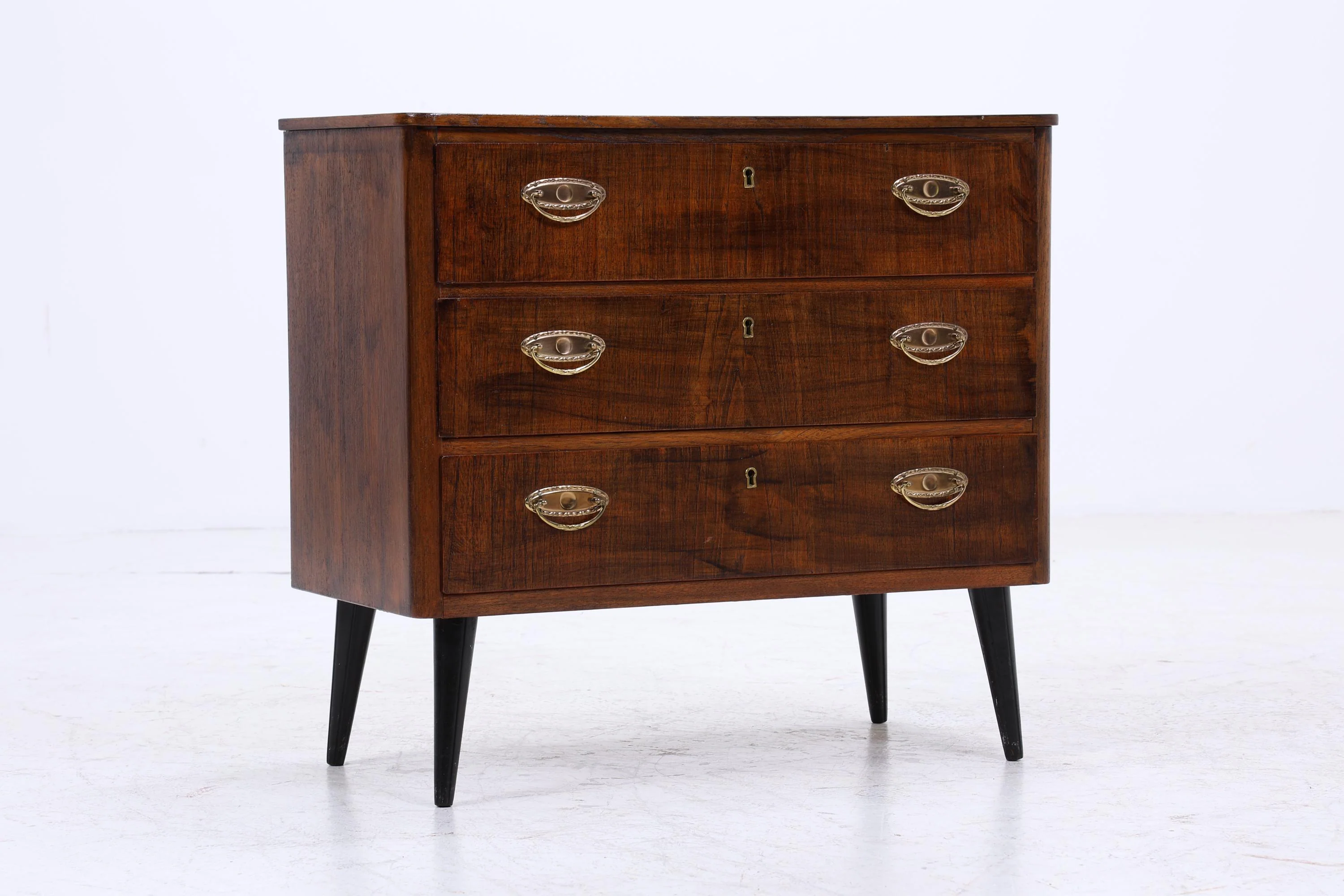 Schöne Vintage-Schubladenkommode aus den 60er/70er Jahren mit klarer, kompakter Form und ruhiger Holzoberfläche. Drei Schubladen geben eine einfache, saubere Struktur – funktional aufgebaut.