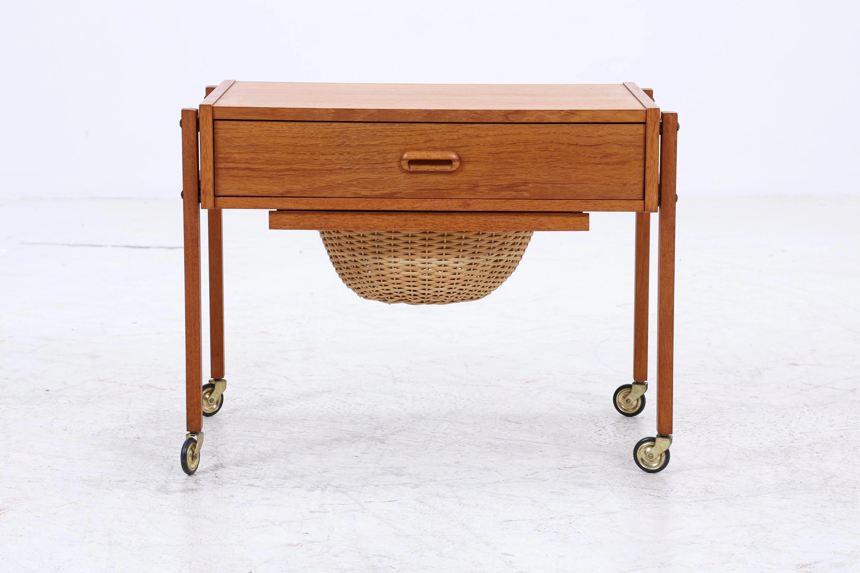 Schöner Vintage-Teak-Nähkasten aus den 60ern mit klarer, funktionaler Form und warmer Maserung. Ausziehbarer Korb und unterteiltes Innenfach machen ihn praktisch – auf Rollen gebaut, flexibel nutzbar und sauber durchdacht.