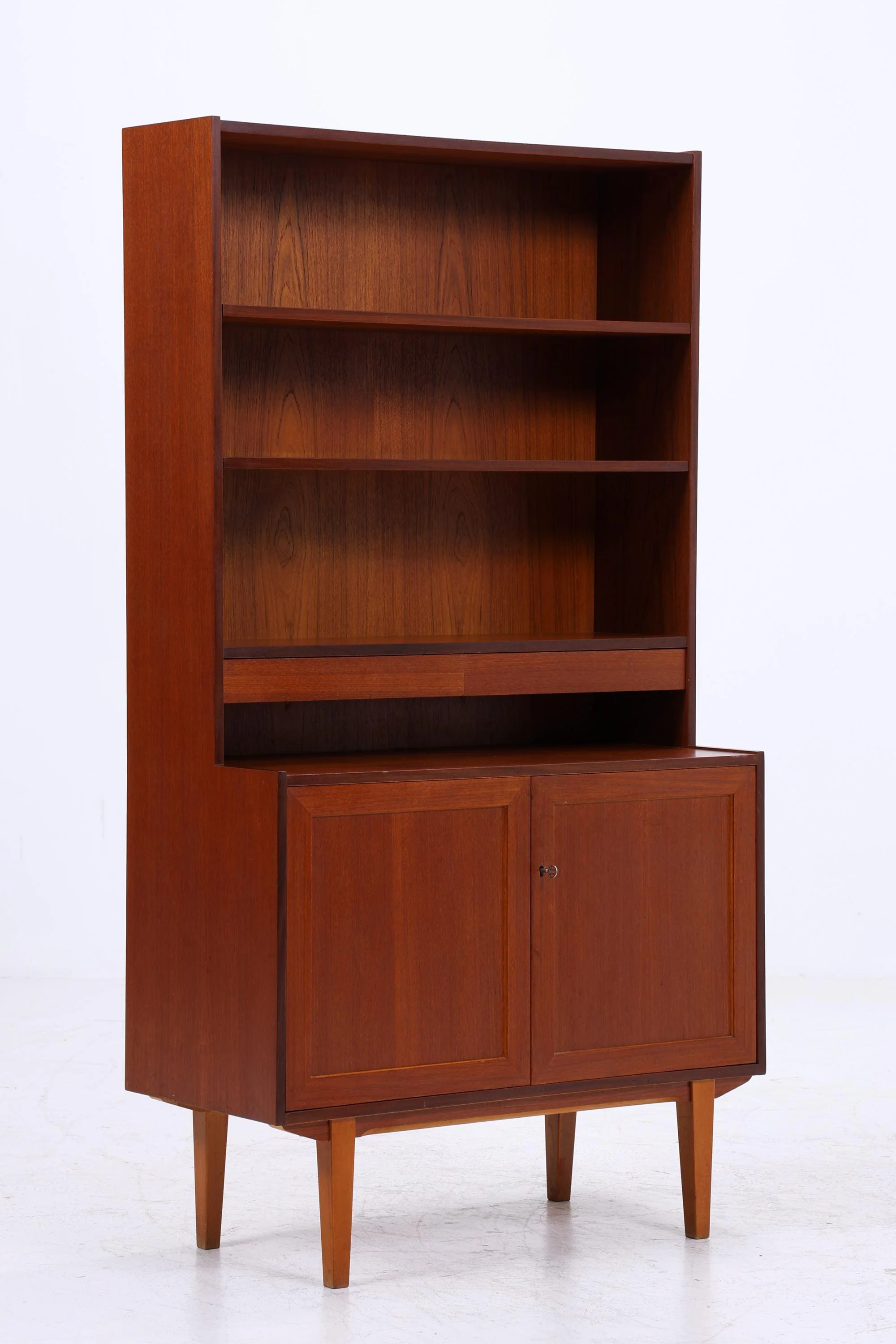 Schönes Teak-Regal aus den 60ern mit klarer Mid-Century-Form. Offene Fächer, zwei Schubladen und Türen geben ihm genau die Mischung aus Leichtigkeit, Stauraum und warmem Vintage-Charme.